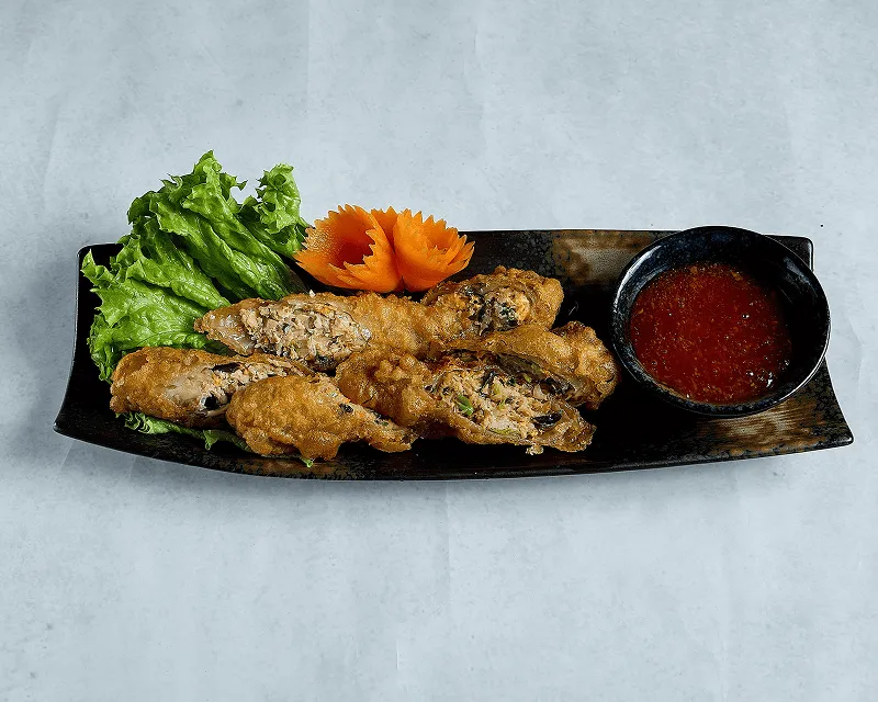 Frittierte Garnelen, Gurke, Frischkäse, ummantelt mit Flussaal