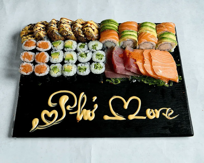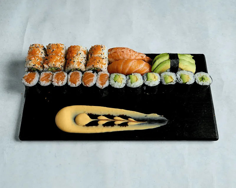 8x Sake I.O, 6x Maki Salmon, 6x Maki Sake, 6x Maki Avocado, 2x Nigiri Sake