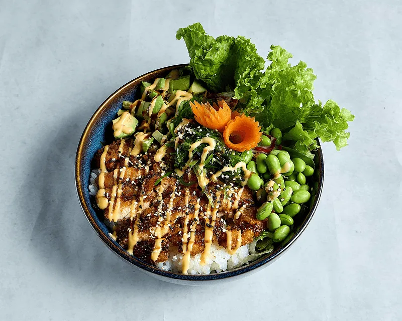 panierte Rolle mit Hühnerfleisch, Avocado, Frischkäse, Sesam und SpezialSauce