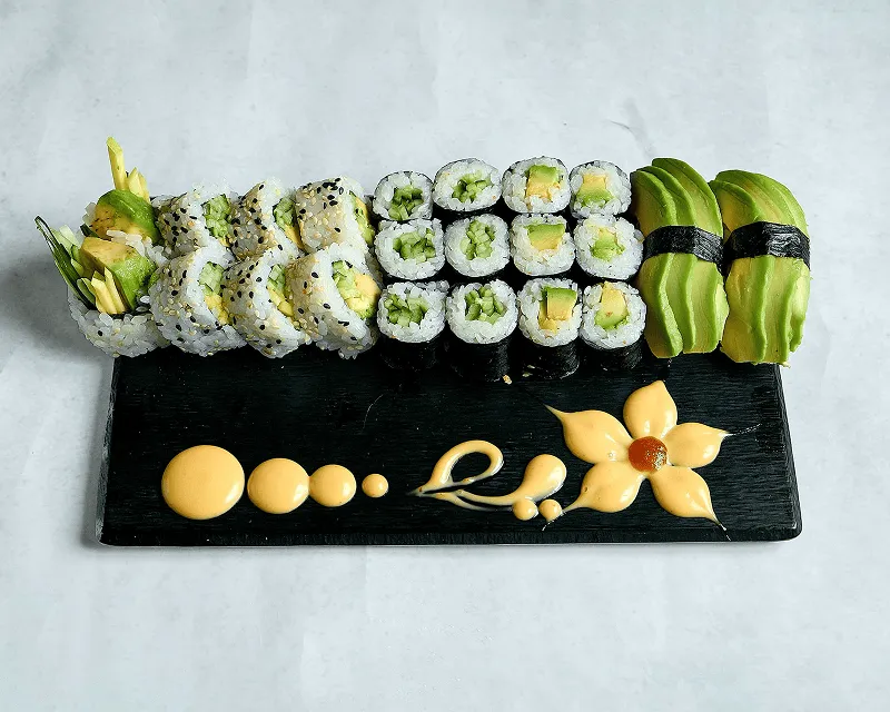 8x Vegan I.O, 6x Maki Kappa, 6x Maki Avocado, Nigiri: 2x Avocado